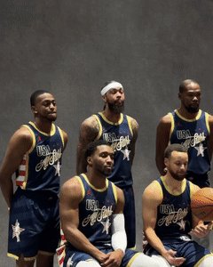 NBA众星齐聚洛杉矶,在全明星媒体日接受采访以及拍摄定妆照和大合影,美国星条队阵容合影,库里双手抱球坐在C位,米切尔和布伦森坐其两侧,小卡、杜兰特、英格拉姆和福克斯依次站在后排,东道主小卡满脸笑容十分开心;杰伦-布朗和詹姆斯均缺席合影。