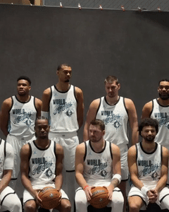 世界队同样合影留念——东契奇和亚历山大均双手抱球坐在C位,贾马尔-穆雷和鲍威尔坐在他们两侧,申京、唐斯、约基奇、文班亚马、字母哥、阿夫迪亚和西亚卡姆站在后排,其中文班站在后排C位十分显眼。