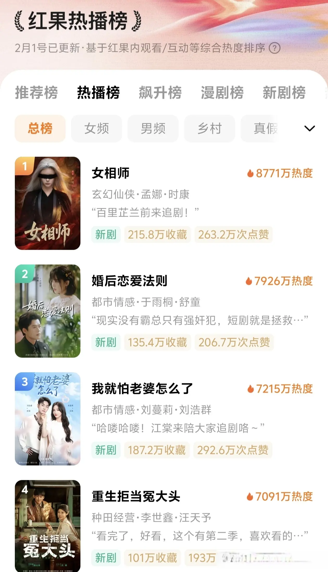 由孟娜,时康主演的短剧《女相师》1月28日一上映就受到了广大网友的关注,热度高居不下,现位于热播榜第一名,收藏量已破200万。