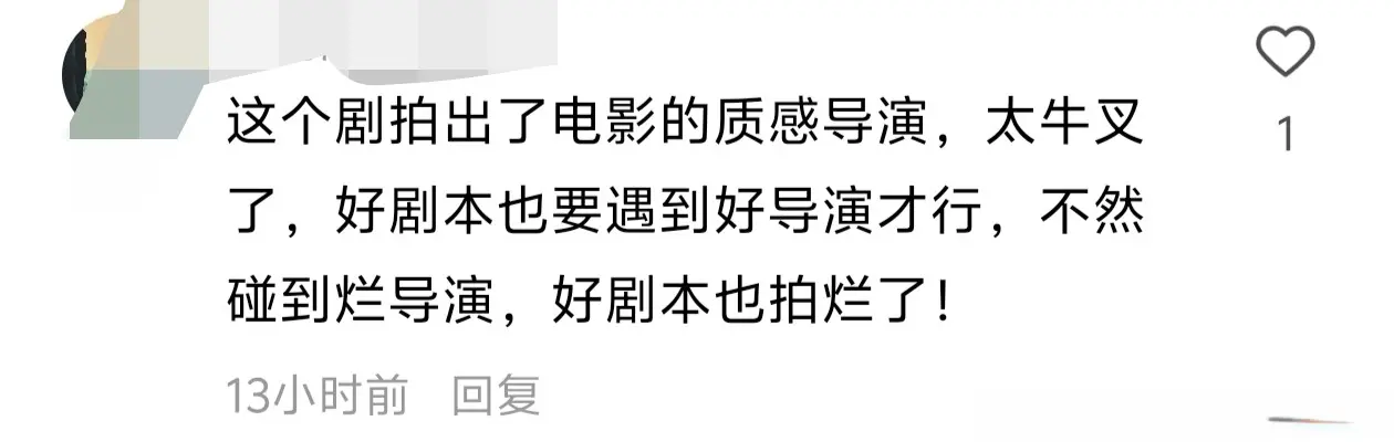 这个剧拍出了电影的质感导演,太牛叉了,好剧本也要遇到好导演才行,不然碰到烂导演,好剧本也拍烂了!